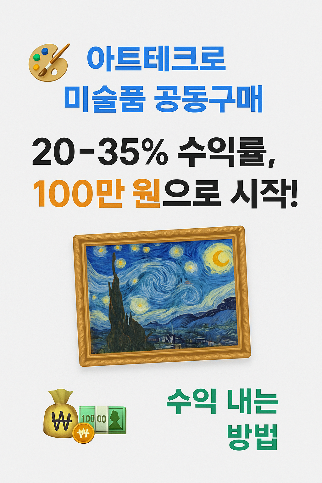 🎯 100만 원으로도 미술품 공동구매에 참여해, 연평균 20~35% 수익을 기대할 수 있습니다.